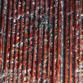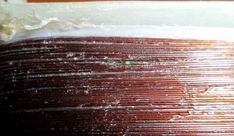 Домотал выходник для 6П13С. Неделя работы. Пропитка, сборка. Первое включение прошло, как старт Челенджера - через пять секунд полета транс сгорел. Притом, что в 220АС для проверки Ктр он вел себя прилично. Вскрытие показало многочисленные пробои изоляции и оплавленный (с разрывом) участок одного витка (см. фото). Надо сказать, что в конце бобины на проводе был обнаружен остаток кусочка лакоткани, вмотанный в бобину, и изоляция провода вокруг него была матовой и шершавой. Разумеется, надо было выкинуть остатки и домотать другим проводом. Но, понадеявшись на пропитку, учитывая ночь, лень и большое земноводное, намотка продолжилась. А это была вторая секция первички. Итог - полная смотка трансформатора с руганью по поводу хорошей сборки и пропитки. Вчера достал из загашника другую катушку провода (чуть больший ∅), намотал три слоя. А поскольку счетчик витков временно не работает - фотографировал и считал пока сохнет клей на последних витках слоя. А на макросъемке обнаружился дефект на сгибах провода - кольцевые трещины лака (см. фото). Провод на заводских катушках, но выпуска годов, когда колбаса была вкусней. Вопрос: мне показалось или, пока не поздно, этот провод тоже надо выкинуть и взять новый или лучший?