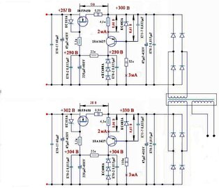 Ув. Александр. Данную схему УМ если не ошибаюсь, реализовал С. Сергеев. В принципе она достаточно проста, но авто.смещение в выходном каскаде оказывает заметное влияние на звучание УМ – по НЧ. Что касается БП, то конструктивно он получится небольшим – один трансформатор для анодного напряжения, диодные выпрямители, стабилизаторы анодного питания драйвера, оконечного каскада будут выполнены на транзисторах и платах с печатным монтажом, габариты не «великие». Кроме того, один трансформатор накального напряжения, к нему два диодных моста и стабилизатора напряжения накала на LM 317. ИМХО - стабилизированое питание, и принцип L-W УМ по звуку достаточно "хорош". Схему, БП УМ выложу в ближайшие дни для рецензии. С уважением.