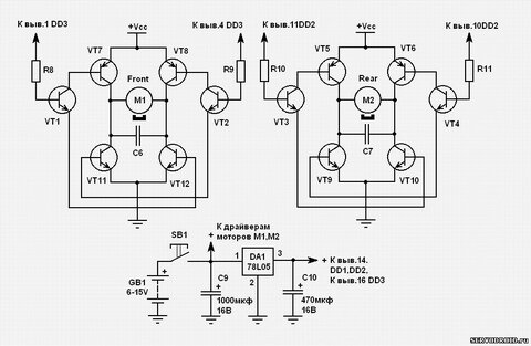 6. Греются в режиме ожидания 139 транзисторы. относительно земли на коллекторах +Vcc с этим разобрался. порылся в гугле - понял что это вроде как так и должно быть(надо будет что то придумать, не есть фен-шуй) я вот думаю поискать схему H-мост, что бы все ключи были закрыты... пока не нашел решение, может быть диоды между эмиттер-коллекторами поставить поможет решить проблему перегрева в ожидании транзисторов.