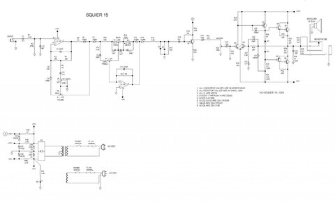 Приятель попросил схему усилителя для гитары. В общем ему нужен комбик ватт на 15-20. После поисков я остановил свой взор на Fender Squier 15. Так как я в музыке, точнее в том как делается звук не силен, то хотелось бы послушать мнение сведущих людей. Заранее приношу свои извинения если буду задавать дурацкие вопросы так как я в этом деле неофит и мне как то хочется вникнуть в схему.