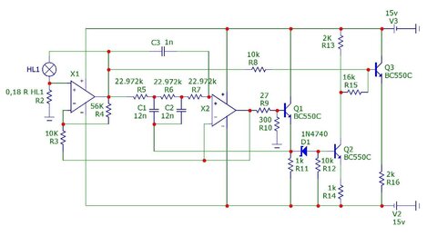 Гость avals Опубликовано 1 Мая, 2015 в 23:55 Жалоба Поделиться Опубликовано 1 Мая, 2015 в 23:55 Валерий! При ближайшем рассмотрении схемы, предложенной Владимиром mvv, оказалось, что это вовсе не Г3-118, а вариация на тему. Сравнение с документацией на оригинал показало весьма существенные отличия как в элементной базе, так и в схемотехнике отдельных узлов. То есть, основная идея сохранена, но 15 отличий найти не сложно. :smile: Посидел, помоделировал в Микрокапе - в сущности, схему можно свести к паре ОУ и трём транзисторам, причём заметной разницы с более "навороченным" вариантом по результатам моделирования не заметно. К повторению не предлагаю, но уверен, что данный вариант будет работать. С помощью R2 устанавливается выходное напряжение, а R15 - минимум КНИ. Но, в сущности, я не совсем об этом. Памятуя о Ваших трудностях запуска генераторов со стабилизацией амплитуды лампой накаливания, хочу предложить Вам схему, которая точно заработает Она достаточно нечувствительна к разбросу потенциометров настройки (R4, R5) и гарантированно запустится. Всё, что надо - это подобрать R2 равное 20% сопротивления Вашей ламы в рабочей точке. Как это сделать? Просто. Напряжение на лампе равно 5/6 выходного напряжения генератора, что благоприятно сказывается на стабильности. Задавшись уровнем, например 5 Вольт, даёте на лампу 4,2 Вольта DC и измеряете ток через неё. Отсюда находите её сопротивление при данном напряжении и впаиваете в схему R2 номинала в 20% от полученной величины. На этом хлопоты с настройкой заканчиваются. Можно измерить сопротивление холодной лампы тестером и впаять, для начала, резистор в четверть от измеренного значения. Окончательно его значение уточнится при установке требуемого уровня выхода. Можно обойтись без умощняющего повторителя, но надо взять лампочку повысокоомнее, поскольку её минимальное сопротивление ограничено нагрузочной способностью ОУ. Скажем, NE5532 работает на 600 Ом, что требует сопротивления ламы в рабочей точке не менее 500 Ом. Большинство ОУ имеют минимальную нагрузку в 1 - 2 кОм. Чтобы быстро оценить пригодность лампы, можно измерить её сопротивление тестером. Если оно Ом 450 и выше - лампа годиться. Скажем, упоминавшаяся ранее лампа 130 V, 2.4 W имеет сопротивление в холодном состоянии 690 Ом и требует R2 от 180 Ом для выхода в 1,5 Вольта до 360 Ом для выхода в 6,5 Вольт. Впрочем, вряд ли стоит экономить на паре транзисторов. "Разгрузка" выхода ОУ наверняка благоприятно скажется на уровне гармоник. Надеюсь, у Вас найдётся время и желание собрать её на брэдборде, померить гармоники и написать, что получилось. Ссылка на комментарий Поделиться на другие сайты Поделиться