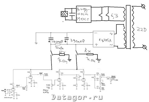 Гость sanya2659 Опубликовано 23 Марта, 2011 в 20:36 Жалоба Поделиться Опубликовано 23 Марта, 2011 в 20:36 Спасибо за рекомендации по очистке совести! Прибор делаю не для себя, не хочу никого убить. Завтра проверю всё это. Отбросило, что я, сидя на диване, облокотился на спинку. Кстати, начал уже рассматривать версию, что второй контакт коснулся корпуса (единственное, чего он мог коснуться). Но что тогда? Просто КЗ. Если честно, то ОБЕ руки держались за корпус, намереваясь перевернуть его. Я был в носках + ковер. Рукой я не мог ничего коснуться. Ах, да, ещё, поскольку это устройство есть педаль Дисторшн, то она была включена в Crate Power Block, что есть усилитель класса Д. Но он не бьётся током. Может какие-нибудь разности потенциалов? Всё это соединялось через вилку Без заземлений, Как видим, Корпус пущен на (-) анодки, а не на Землю. Добавлено после раздумий: Вот собственно схема. Реле установлено на накальную обмотку так, чтобы при включенном устройстве, конденсаторы соединялись с преампом, а при выключенном питании подсоединялись к разряжающим резисторам. При испытании я не учел ток в холодных накалах, поэтому реле запускалось не сразу. Из за чего (видимо) сгорел резистор Rx, а он был 1.5 Ватт. Я перевернул устройство, выдернув из розетки, разрядил конденсаторы, отсоединил один вывод анодной обмотки, включил в сеть, вздумал перевернуть ещё раз, а он меня шарахнул. Ссылка на комментарий Поделиться на другие сайты Поделиться