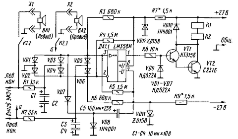 Гость victors Опубликовано 6 Октября, 2011 в 10:46 Жалоба Поделиться Опубликовано 6 Октября, 2011 в 10:46 Если, по расчётам, падение напряжения на датчике тока будет около 1,2В то вместо резистивного делителя, в базу шунтирующего транзистора, можно включить кремниевый диод. При нагревании (повышении температуры внутри усилителя) падение напряжения на этом диоде и на б-э переходе шунтирующего транзистора, будет снижаться, что приведёт к открыванию защитной цепи при чуть более меньших токах через выходные транзисторы. Таким образом можно получить защиту УМ только по току через датчики тока ("токовыравнивающие" резисторы) но и по температуре. Ссылка на комментарий Поделиться на другие сайты Поделиться