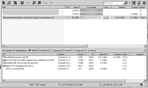 Гость hsl Опубликовано 31 Июля, 2012 в 09:18 Жалоба Поделиться Опубликовано 31 Июля, 2012 в 09:18 (изменено) Очень хочется проверить идею angelv.Я сделал торрент-файл из первого попавшегося кино (оказалось это полностью восстановленный "Тегеран-43"). Вот я этот торрент в архиве просто прикрепляю здесь: Пластилиновая_ворона.avi.torrent.7z (файл обновлен!) И чего, теперь любой желающий сможет фильм у меня скачать? А скорость от чего зависит? У меня скорость на отдачу не плохая = 10 Мегабит. У кого получится скачать - напишите, что вышло? Для удобства торрент файлы обычно выкладывают не в архиве, а как есть, тогда торент файл сразу открывается прогрммой, если это настроено конечно. Есть еще один момент, может все и вкурсе, но на всякий случай озвучу, касаемо это тех случаев когда в инет выходим через роутер, сейчас, когда у многих дома по нескольку компьютеров это уже не редкость. Так вот, для нормальной работы нужно на роутере открывать порты с внешки на тот комп с которого идет раздача. В принципе, сейчас торент как бы может и без открытых портов раздавать, но работает это как то не очень. По моим личным наблюдениям получается так, пока я что то качаю, качают и у меня, но как только я все скачал скорость раздачи резко падает и идет потихоньку, но может быть это только у меня, хотя это и не на одном компьтере наблюдалось. Файл кстати не качается, пиров не видно ни одного. Пиры кстати можно и вручную добавлять в формате IP:порт В конце концов файл скачался, с кого качался просмотрел, роздано 0, но у меня и порт не открыт. Изменено 31 Июля, 2012 в 10:16 пользователем hsl Ссылка на комментарий Поделиться на другие сайты Поделиться