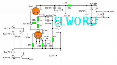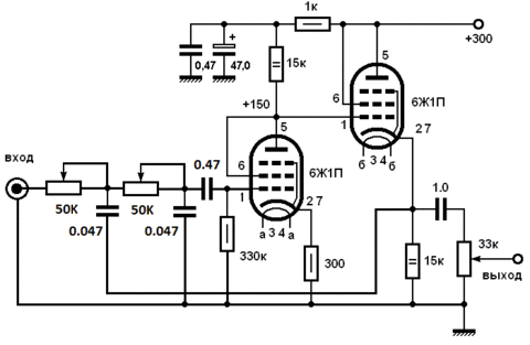 TANk Опубликовано 3 Апреля, 2013 в 07:32 Жалоба Поделиться Опубликовано 3 Апреля, 2013 в 07:32 Подходит. Резистор на 1 мОм можно сделать и поменьше - 100-300к вполне хватит. Особенно если электролит после него не очень качественный с утечкой. 1МОм можно поставить, если вместо электролита поставить пленочный конденсатор на емкость примерно 1-2мкФ, но у них габариты оставляют желать лучшего. Для умножителя конденсаторы С1, С2 лучше взять раза в 2 - 3 побольше. 220-470 мкФ а напряжение им можно уменьшить, поскольку включены последовательно. Хватит на 200в, даже на 160в можно. В компьютерном БП горелом можно такую пару найти как раз 2шт на 200в стоит емкостью от 330 до 680мкФ. С3 вполне хватит и 100 мкФ но напряжение уже должно быть полное - 350-450в. Если не будет хватать усиления (у этой схемы примерно 10 по напряжению) то катодный резистор первой лампы можно зашунтировать электролитом на напряжение 10-16в емкостью 1000-3300мкФ Конденсатор подбирать качественный, желательно предназначенный специально для звукового применения, желательно зашунтировать пленкой (полипропилен, полистирол) или бумагой емкостью порядка 1-4мкФ. Этот конденсатор дает окраску в звуке, так что окончательный подбор уже на свой слух, как нравиться. С конденсатором в катоде усиление будет порядка 15 по напряжению. Еще как вариант регулятор громкости перенести на выход этого каскада. Вместопостоянного резистора на 33к. По входу у него перегрузочная способность достаточно большая, можно подавать сигнал амплитудой 2.5-3в не боясь перегрузки. Входное сопротивление усилителя тогда возрастет примерно до 300кОм. Может быть полезным для слабых источников сигнала. Ссылка на комментарий Поделиться на другие сайты Поделиться